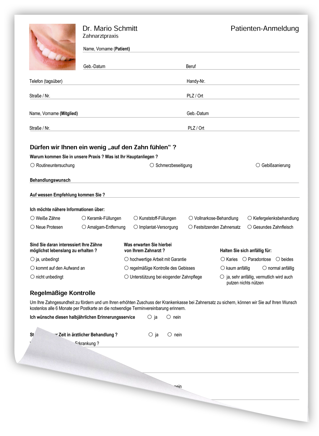 Wir empfehlen zwei Vorsorgeuntersuchungen pro Jahr, um Ihre Zahngesundheit langfristig zu erhalten. Unser Tipp: Vereinbaren Sie Ihren nächsten Termin am besten direkt im Anschluss an Ihren Besuch. Für Ihren ersten Termin können Sie unser Anmeldeformular vorab herunterladen, in Ruhe zu Hause ausfüllen und zum Termin mitbringen.